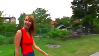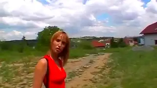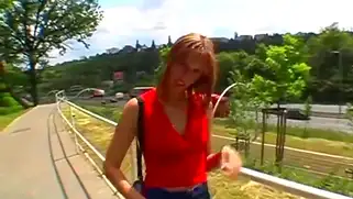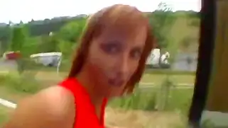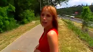 Рыжая блядь в красном готова делать минет и ебаться на улице