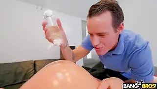 В огромную жопу красавицы, покрытой маслом пихают здоровый хуй после массажа