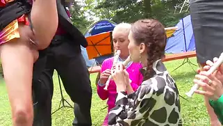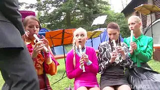 Порно видео HD, Сучки - Женский порно оркестр репетирует на лужайке перед домом когда дирижер достает большой член. Сучки играют на флейтах, а мужик устраивает для них золотой дождь, после чего трахает красоток на зеленой траве