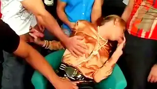 Шатенка с блядским лицом любит когда на нее кончают толпой