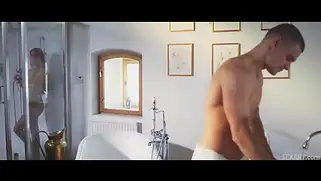 Голубоглазая блондинка с отличной задницей классно прыгает писькой на члене