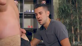 Дружеский секс как способ помочь приятелю в глубоком минете с камшотом в ротик