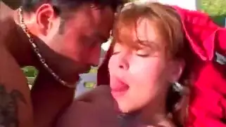 Рыжая сука с натуральными сиськами ебется в шезлонге на природе