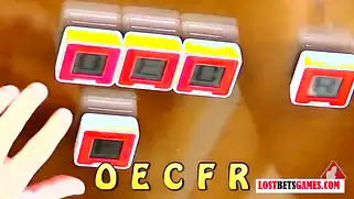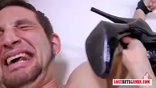 Бабы играют с мужиком на раздевание и связав его, пинают по яйцам