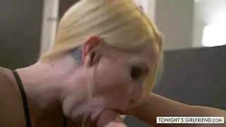 Порно видео HD, Кончил на лицо - Ухоженная бизнес леди, грудастая зрелая блондинка в черных чулках, прибыла на случку с парнем. Деловой мужик решительно вылизал киску гостьи, потом давал сосать хуй, довел бабу до оргазма и кончил в лицо