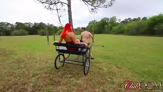 Порно видео HD, Госпожа - Госпожа толстушка с оранжевыми волосами и большими сиськами развлекается с жирным рабом на природе. Голый мужик в массивном ошейнике запряжен в повозку для домины и исполняет любые женские капризы на улице