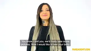 Красивая девушка с цветными татушками ебется на порно кастинге