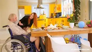 Порно видео Минет, Девушка дрочит киску - Действительно, красотка спасет мир, как говорилось в известном выражении. Девушка симпатичная и миленькая увидела бедного старичка, который одиноко сидел на вечеринке за столом и решила его развлечь. Праздник как раз был в его честь, но все разбежались и он был один. Она залезла на стол и показала влажную киску, которую позволила лизать и дрочить, а затем подарила ему секс с молодой собой.