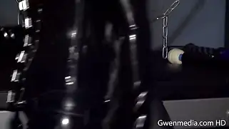 - Одна девушка облачена в резину, а вторая будет доминировать над ней. Это БДСМ латекс порно, в котором связанная сучка будет стонать от приятных ощущений, когда головка секс игрушки касается сосков или вагины через костюм. Она стонет, но слышно только мычание, потому что во рту кляп и плотная маска из резины.