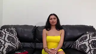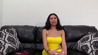 Яркая брюнетка в желтом платье проходит анальный порно кастинг