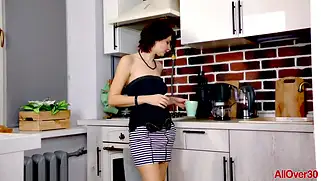 Milfs - Зрелая русская домохозяйка с висячими натуральными сиськами дрочит киску у кухонной плиты. Красотка сидит с раздвинутыми ногами и погружает пальцы во влагалище, мы видим как сильно намокла рука шалавы