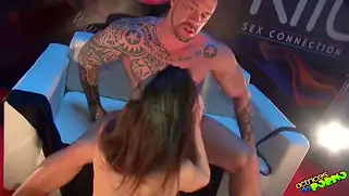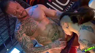 Порно видео HD, Секс с сучкой - Публичный секс на сцене с татуированной сучкой устраивает накачанный мужик с наколками. Ебарь отращивает бородку и лижет женские дырочки на людях, порево завершается сливом спермы прямо перед толпой людей