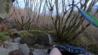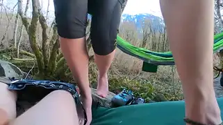 - После минета в гамаке красотка без верхней одежды начала ебаться с приятелем, который и привел её сюда в лес. Молодые трахаются под музычку приятную и под щебетание птичек. Они развели костер и поставили палатку рядом. Бабе нравится такая романтика и даже возбуждается она быстрее, кончая одновременно с парнем.