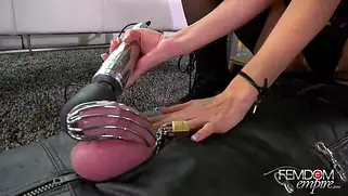 Порно видео HD, Вибратор - Госпожа красавица сидит на лице послушного раза и дрочит хуй парня. Сучка в эротическом костюме держит в руках электрический вибратор, которым стимулирует мужские яйца, мужик собирается кончить спермой