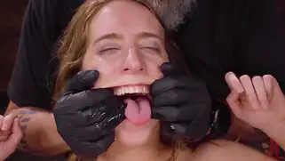 Порно видео HD, Связанная - Связанная рабыня сквиртит на бдсм шоу с опытным мастером. Когда худенькую девушку раздевают, у нее оказывается волосатая киска. Мужик в перчатках вгоняет в рот с пиздой бабы огромную насадку, баба кончает
