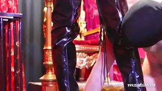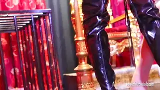 Порно видео HD, Заставила лизать - Красивая госпожа заставила раба лизать обувь и чувак в маске стал ласкать языком кожаные ботфорты бляди. Вокруг послушного парня на полках стояло множество всяких секс игрушек, которые были готовы к аналу