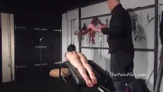- Бритоголовый мужик кладет девушку на специальный лежак, на котором она будет вертеть задницей и ёрзать, потому что её ждет страстная порно порка. Кожаной плеткой лысый типок будет шлепать булочки, которые со временем краснеют и она издает стоны, но они похожи на стоны удовольствия, а не боли или дискомфорта.
