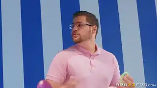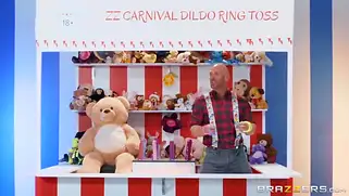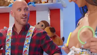 Johnny Sins - Johnny Sins предлагает симпатичной девушке поиграть в игру и выиграть плюшевую игрушку. Она решает поиграть в другую игру под названием ебля. Изменяет парню, пока тот шляется не понятно где и получает от мужика лысого длинный член в киску и в ротик, от чего и кончает потом сама, а затем принимает сперму в горло.