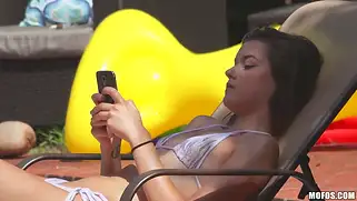 Жопастая наездница скачет резво на члене здоровом в секси бикини у бассейна