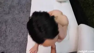 Порно видео HD, Супер трах - Бабу с супер сиськами трахнули на кастинге и залили спермой. Грудастая брюнетка сосет хер ведущего от первого лица и ебется на кремовом диване. Чувак гоняет конец между женскими грудями и кончает на шалаву