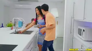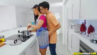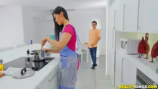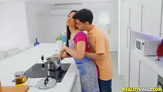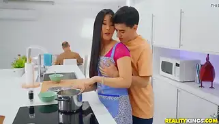 1000porno - Худой парень учуял запах с кухни, а там его сеструха готовила вкусную хавку. За старания он решил её отблагодарить лаской и начинает тискать за жопу и титьки, но тут появляется батя и мешает всем планам. За столом он сделала куни ей, а затем продолжает тискать попень и лижет очко, от чего узкоглазая кайфует.