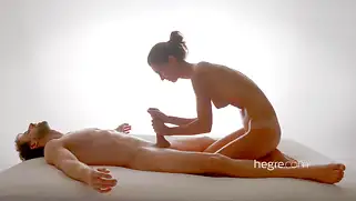 Порно видео Красивый секс, Красивая пизда - Низкий парень на белом матрасе и в белоснежной комнате полностью голый сидит в ожидании массажа члена и яиц. Милашка на голову выше партнера, что не мешает ей наклоняться к самцу и брать в ротик вялый пенис, поднимая его тем, что красиво сосет хуй и облизывает головку, мастурбируя одновременно ствол. Яички мнет руками и доводит челика до максимального возбуждения, но оргазма не случается. Типок отвечает похожими ласками и массирует клитор, когда красотка раздвигает ножки, сев напротив красавчика. Кайфует от приятных ощущений, когда пальчиком теребят письку. У намасленного извергается сперма от ручек нежных бабы.