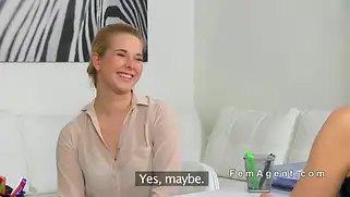 - Девушка притопала на порно кастинг, в котором будет показывать обнаженное тело и позировать голой попкой и титьками. Шлюшка выполняет указания режиссера и с ней в компании будет вторая бабёнка, с кем и происходит страстный трах. Лесби секс набирает обороты и на диване случается лизание письки. Куни заводит новоиспеченную порнозвезду и теперь обе шалашовки без одежды обнимаются, целуются в губки, теребят дырочки между ног, а затем няше в руки дали вибратор, которым куколка и проникает в глубины пиздёнки. Оргазм настирает всех участников лесбийского порева, а мужик с камерой старется снять качественное видео.