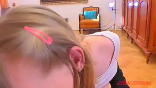 - Дамочка опытная не против наблюдения эротической и порнографической сцены, если ей занять её муженёк со студенткой какой-то. 19-летняя красавица приходит в роскошный дом с высокими потолками, где собирается позировать перед стариком озабоченным. Пошляк планирует снять порнушку и девахе отводится главная роль в ней. Бабе предстоит показать обнаженное тело, что куколка и делает, а затем становиться для отсоса на коленки. Случается оральный трах, а жена ебаки сидит сзади и будет спокойно смотреть секс, даже не ревнуя ни минутки. Пенис чувака проникает то в ротик, то в вагинальную дырочку блондиночки.