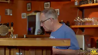 - Пока бармен отсутствовал, дед трахнул его девушку. Но ситуация усложняется тем, что красавчик - внук старика, а самочка его деваха. Похабный старикашка с сединой на голове оказался очень озабоченным типом и с удовольствием захотел поиметь самочку, насаживая её на маленький член. Началось все с поглаживания по ляжкам и флирту. Опытный самец легко уговаривает суку на секс и стартует горячий трах с низким дедулей и стройной няшкой с длинными ножками, что громко стонет от лизания пизды. Умелый язык приятно двигался по клитору и половым губкам, а по окончанию траха на столе случается камшот на лобок.
