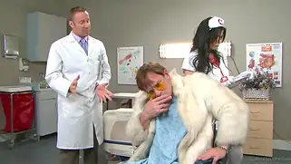 - Известная рок звезда приехала лечиться в больницу, но ему отказывают в дорогостоящем лечении. Разъяренный самец ломает гитару об колено и буянит, а успокоить его пришла сексуальная медсестричка. Мед персонал больнички вежливый и заботливый, а доказать дамочка собирается это через порнушку, устроенную мужчине. Шлюшка насаживается на твёрдый пенис мужика, начиная прыгать верхом вагинальной дыркой. Доктор стоял в стороне некоторое время, пока не решил заняться документами в другой комнате. По завершению порнухи чувак голый залил спермой аппетитную жопку бабёнки, трясущую перед лицом сракой.