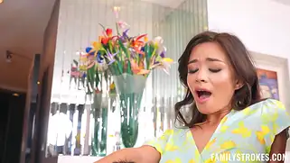 Жадно вылизывает письку, посадив кралю на стол перед домашним сексом на кухне