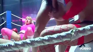 Два боксера затащили на ринг шалав и трахнули их, кончив в ротики