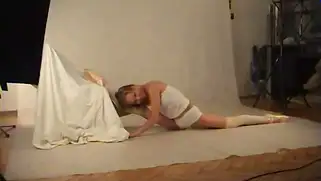 Гимнастка в белых трусиках садится на шпагат и позирует в гольфах
