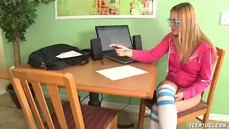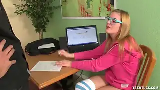 Блондинка в смешных очках в два счета выдрочила сперму на грудь