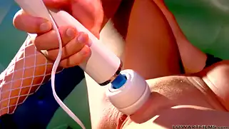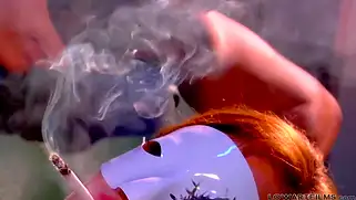 Курящая шлюха в маске дрочит пизду вибратором и ебется с самцом