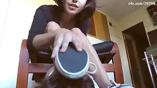 Симпатичная брюнетка топчется по мужскому лицу ногами и кайфует
