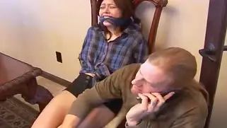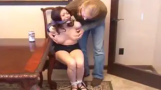 Связал сисястую брюнетку на стуле, а затем выебал на столе