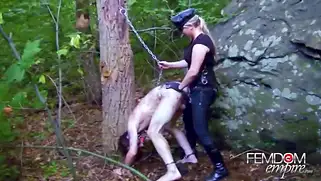 Привязала мужика к дереву и оттрахала в жопу большим страпоном