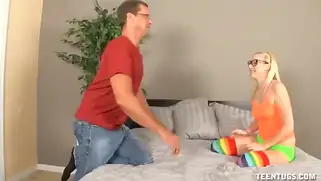 Очкастая молодая блондинка дрочит хуй и получает сперму на лицо