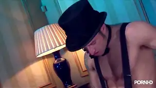Два мужика в костюмах устроили бабе анальную еблю в камшотом