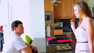 Жадно вылизывает письку, посадив кралю на стол перед домашним сексом на кухне