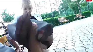 Порно видео Мастурбация, Дрочит хуй - Молодая русская телочка в колготках дрочит член парню на скамейке в парке. Она с энтузиазмом наяривает ножками хуец чувака, пока он не кончает на ступни.