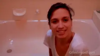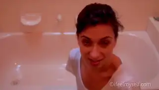 Брюнетка в пенной ванне гладит роскошное тело и кончает