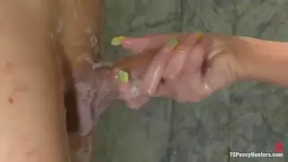 Порно видео Минет, Во все щели - Сексуальная транссексуалка с точеной фигурой после помывки в душе ебет во все щели симпатичную блондинку, красотки ебутся под душем и кончают синхронно