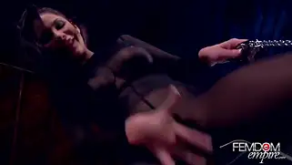 Красивая брюнетка в капроне заставляет раба лизать свое тело