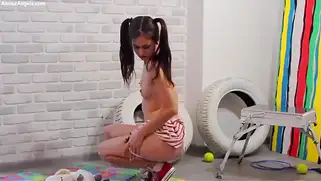 - Голая молодая теннисистка позирует с мячиками в старом гараже