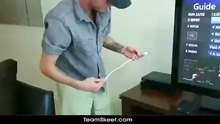 Молодой телевизионный мастер отдрючил клиентку на ее на кожаном диване