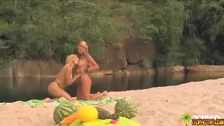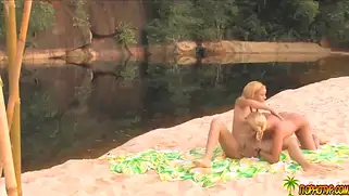 Никки с подружкой ласкаются на песке, используя секс игрушки