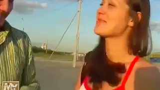 Сисястую русскую брюнетку ебут вдвоем стоя питерские пикаперы