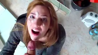 Порно видео В Сперме, - Капли густой спермы остались на верхней части прелестного личика рыжеволосой телочки после минета, красотка тщательно пососала хуй и приняла камшот лицом